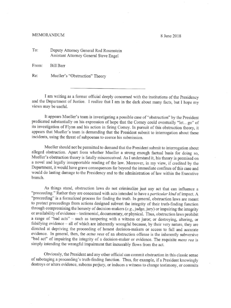 June 2018 Barr Memo to DOJ Muellers Obstruction Theory 1 – Free download as PDF File (.pdf) or read online for free.